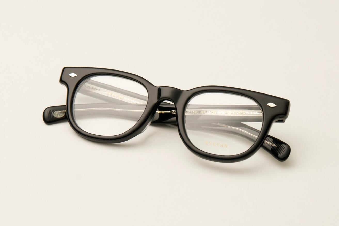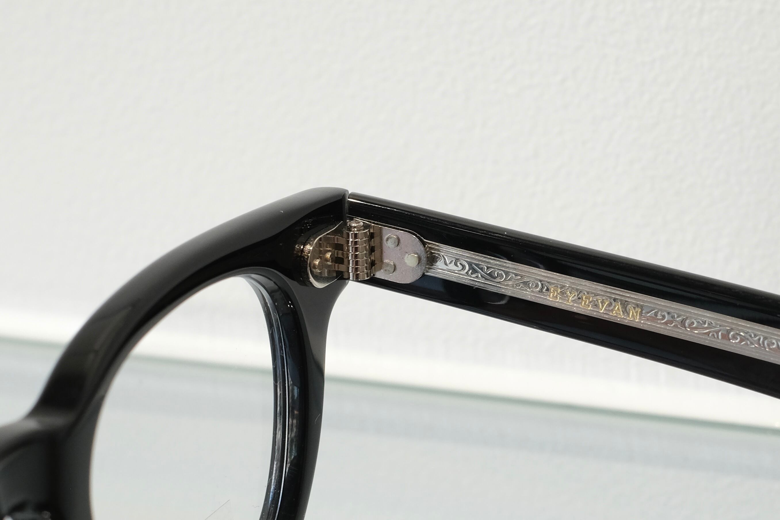 1960年代にJAZZミュージシャン、YUSEF LATEEFが愛用していたフレンチヴィンテージとアメリカンヴィンテージを融合したかのような名作フレームが着想源。テンプルはオリジナルデザインを部分的に抑揚ある形状にリデザインし、フロントにはオリジナルのダイヤ型飾り、丁番にはデザインとしても美しい置き丁番を採用した。ヴィンテージを出発点としながらも現代的な解釈を加えることによって、EYEVANが今最も美しいと考えるウェリントンデザインとなった。