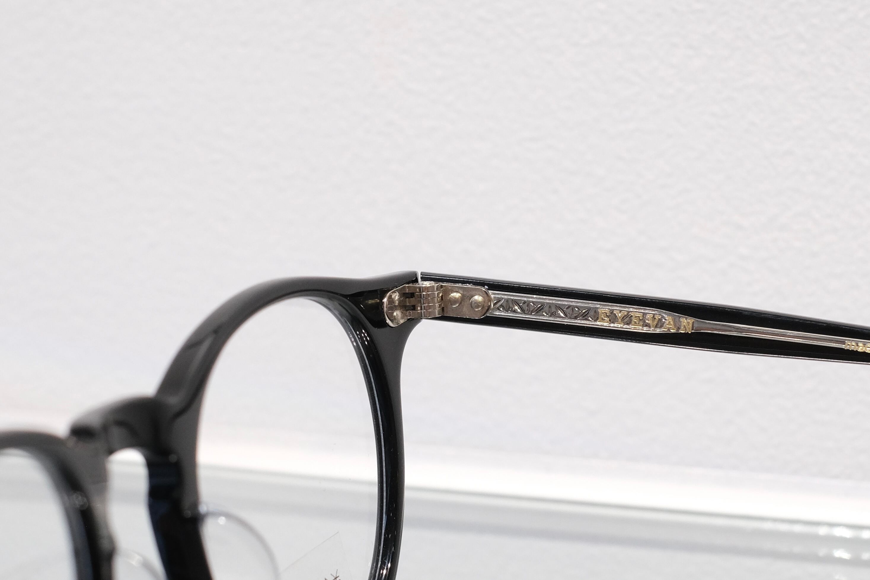 フロント、テンプルには2PINのかしめ、丁番にはヴィンテージフレ ームにみられる埋み(うずみ)丁番を採用。