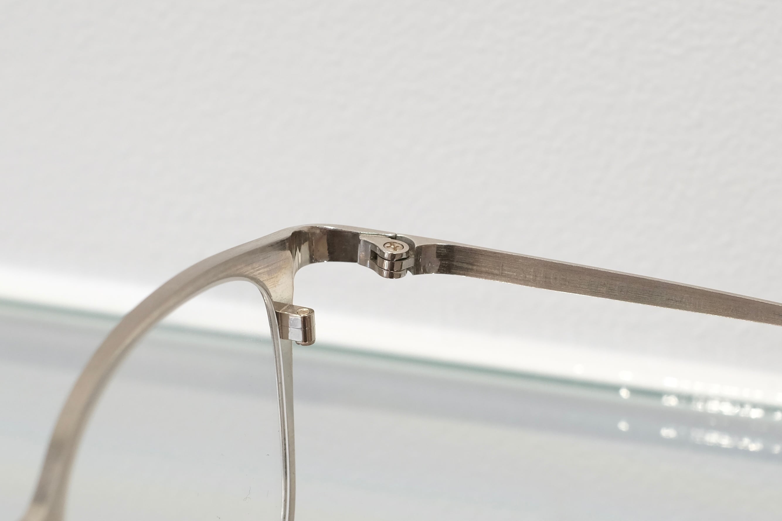 フラットな板状メタルには繊細なヘアライン加工を施し、テンプルエンドにはセル生地を組み合わせています。