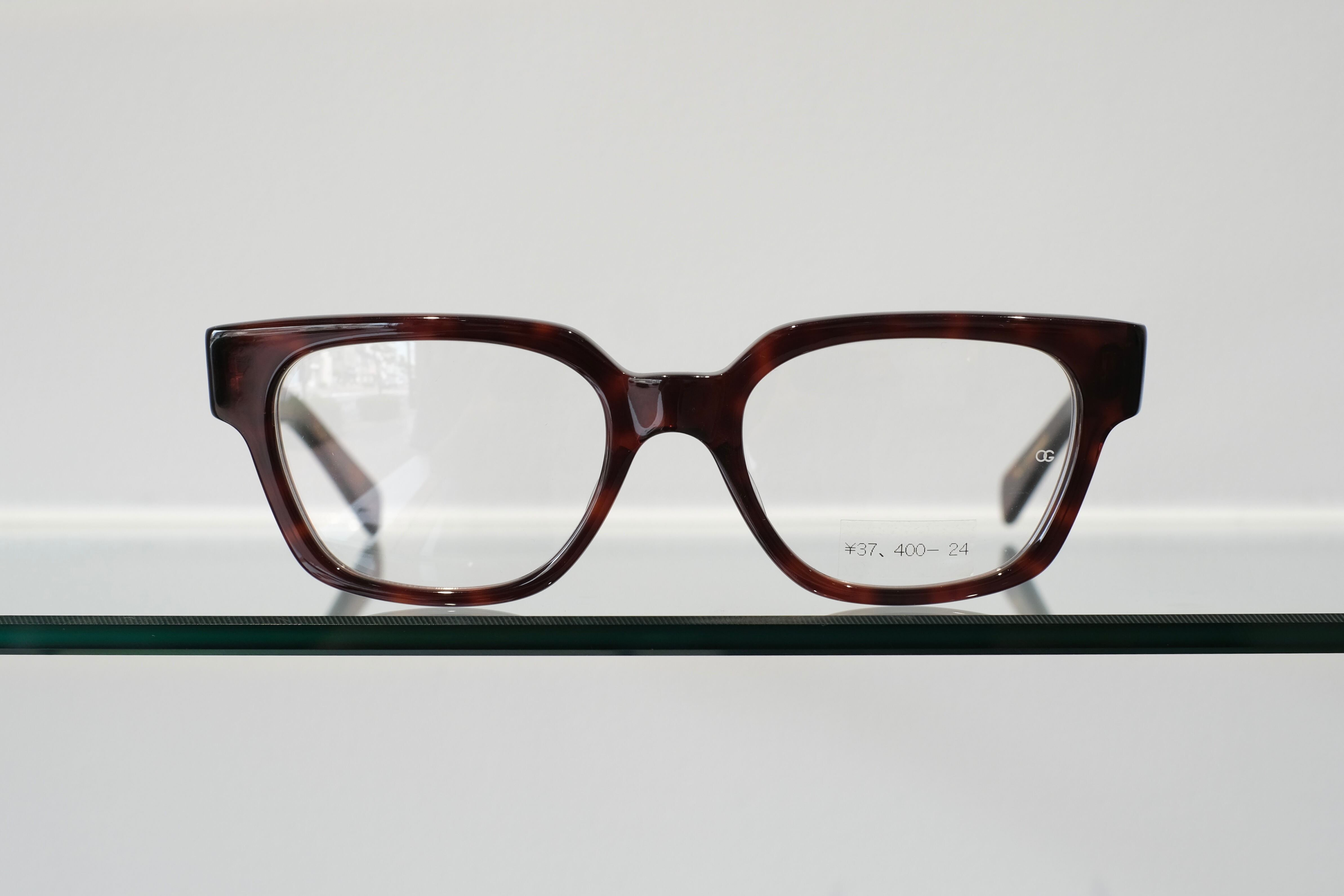 ウェリントンとスクエアの中間を思わせるレンズシェイプ。